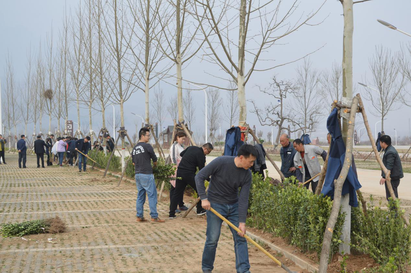 在植树活动中,大家克服地面石头较多的困难,利用大型机械吊卸成型法桐树,给法桐树固定防风木桩,并及时浇水,确保栽植树木的成活。