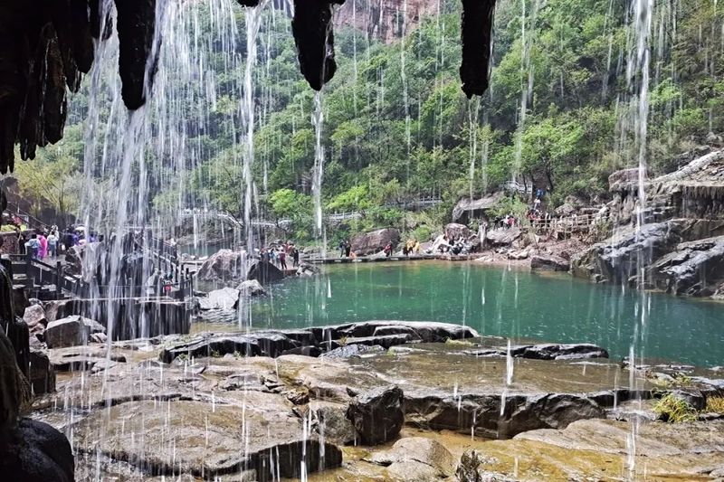 让众多游客慕名而来的便是天河瀑布下面的两大奇观:一是瀑布后面的水帘谷,游客沿此处可穿越瀑布,也是八里沟“百丈漈”的打卡点;二是瀑布下的水帘洞,里面石花、石笋相互交错别有洞天。